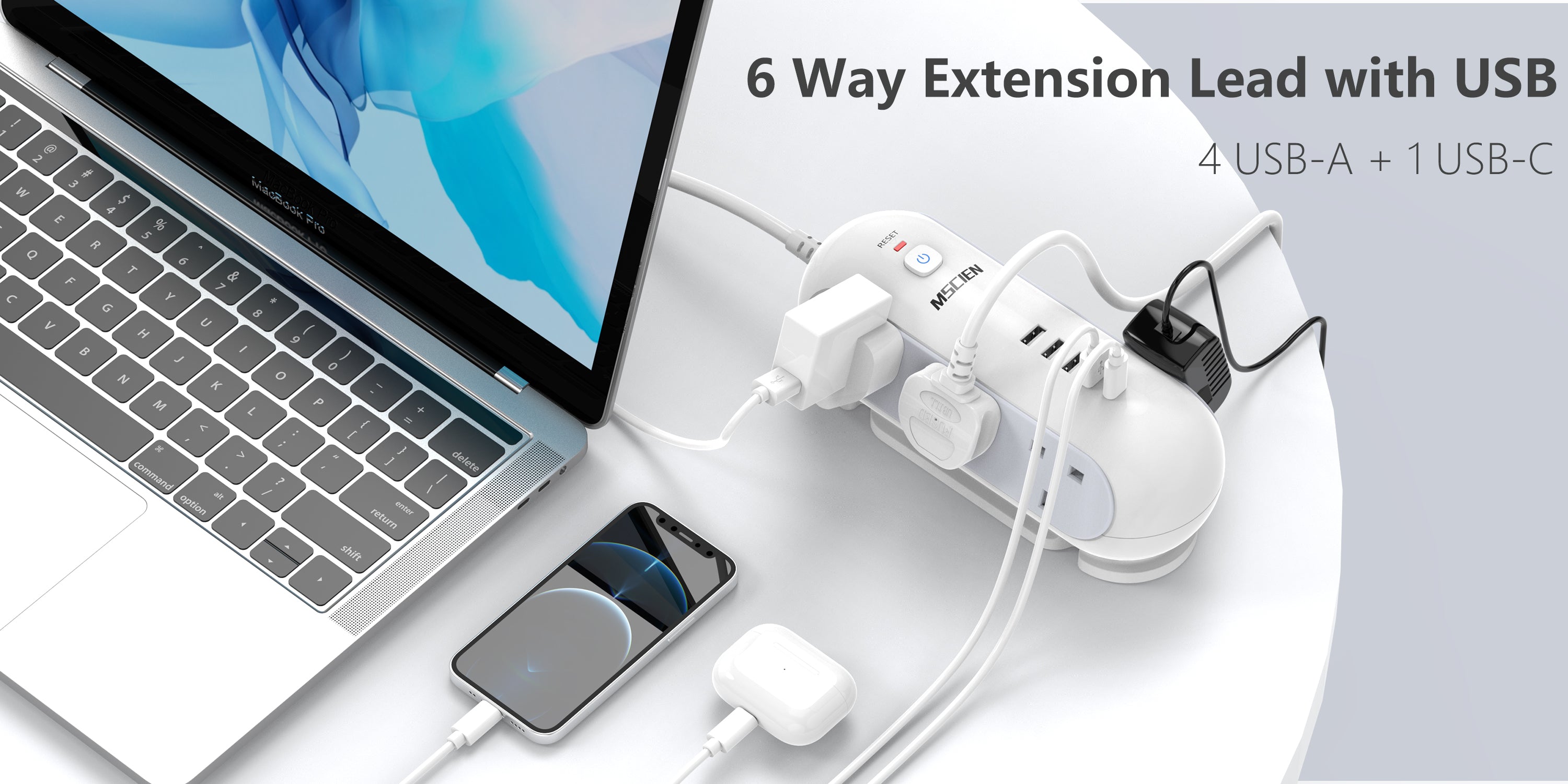 5M 6Gang Extension Lead with USB Slots (1 USB- C and 4 USB-A), Overload Protection, Surge Protection