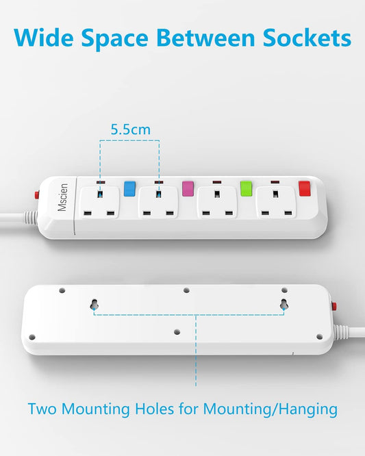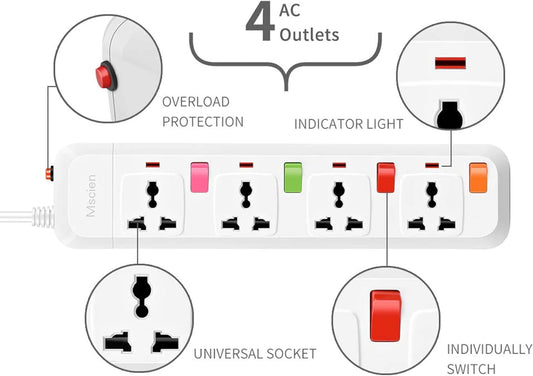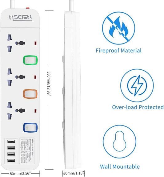 سلك تمديد 1.8 متر 3Gang مزود بـ 4 فتحات USB-A، وواقي من الحمل الزائد يتم تبديله بشكل فردي