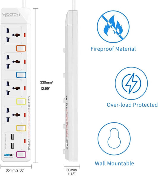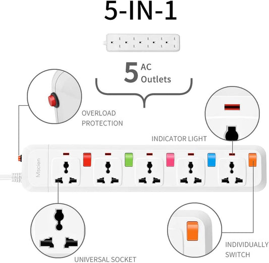 سلك تمديد 1.8 متر بخمس مجموعات مع مفاتيح فردية وحماية من الحمل الزائد وقابل للتركيب على الحائط