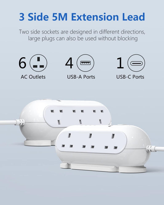 1.8M Extension Lead with USB Slots, 4 Way 3 USB(3.4A, 1 USB C, 2 USB A) Extension Socket, Surge Protected UK Power Strips