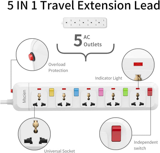 كابل تمديد 1.8 متر 5Gang للسفر من المملكة المتحدة إلى الولايات المتحدة الأمريكية مع تبديل فردي وواقي من الحمل الزائد