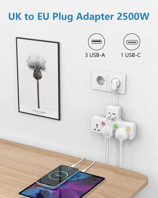 محول قابس المملكة المتحدة إلى أوروبا مع 3 منافذ USB، قابس محول سفر من المملكة المتحدة إلى الاتحاد الأوروبي، شاحن أرضي من Schuko لألمانيا وفرنسا وإسبانيا وتركيا واليونان وأيسلندا، محول قابس من النوع E/F