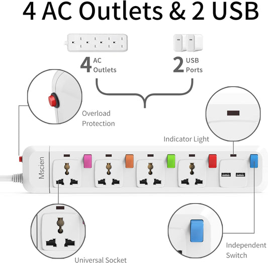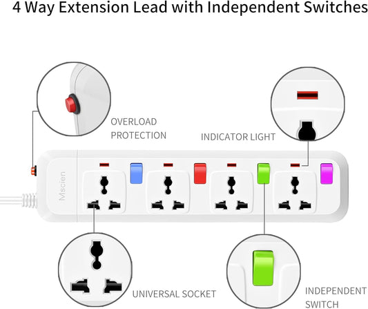 كابل تمديد 1.8 متر 4Gang للسفر من المملكة المتحدة إلى الاتحاد الأوروبي مع 2 USB-A، يتم تبديلهما بشكل فردي، وواقي من الحمل الزائد