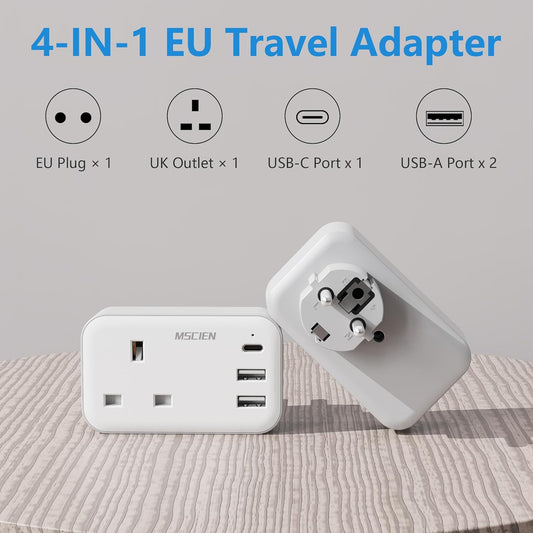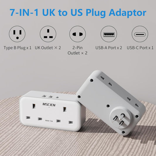 محول قابس من المملكة المتحدة إلى الولايات المتحدة، محول سفر أمريكي مؤرض من Mscien مزود بـ 3 منافذ USB (1 USB C)، محول قابس مزدوج بمقبس ثنائي السن من المملكة المتحدة إلى أمريكا وكندا وتايلاند والمكسيك وجامايكا والفلبين (النوع B)