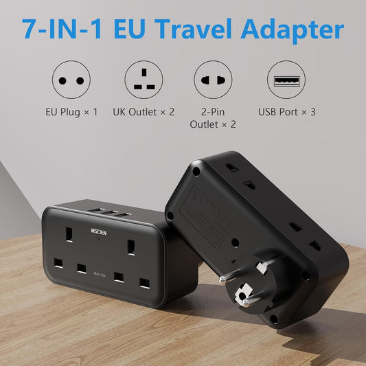 محول قابس سفر ثنائي النطاق من المملكة المتحدة إلى أوروبا مزود بـ 3 منافذ USB-A، أسود، نوع E/F، شاحن لألمانيا وفرنسا وإسبانيا وتركيا واليونان
