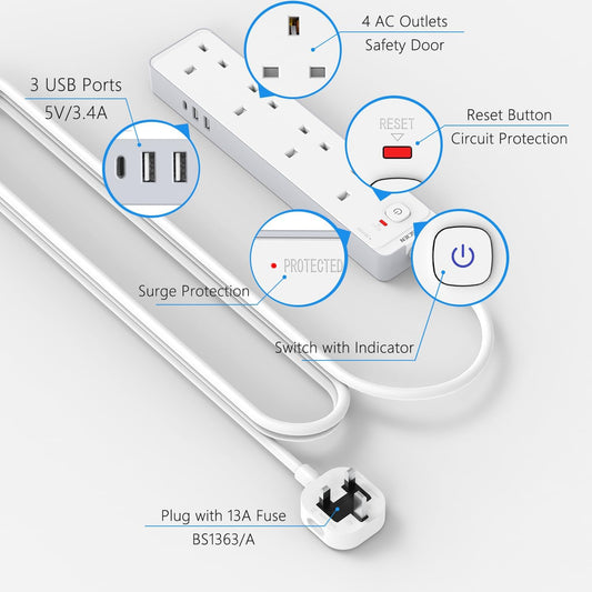 1.8M Extension Lead with USB Slots, 4 Way 3 USB(3.4A, 1 USB C, 2 USB A) Extension Socket, Surge Protected UK Power Strips