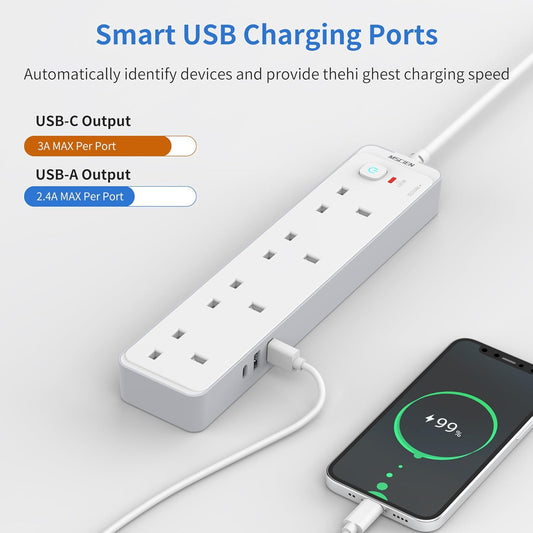 Mscien 5M Extension Lead with 3 USB Slots(3.4A, 1 USB C, 2 USB A), 4 Way Extension Socket with Switch Wall Mountable