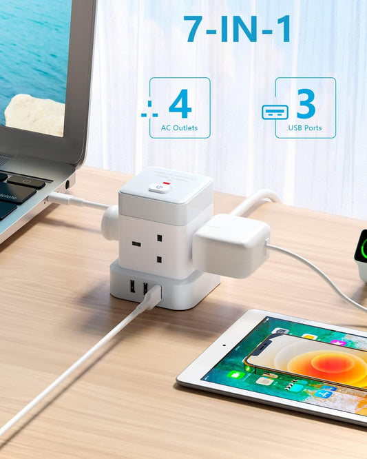 سلك تمديد مكعب 4Gang بطول 4 أمتار مع 3 منافذ USB-A، حماية من التحميل الزائد