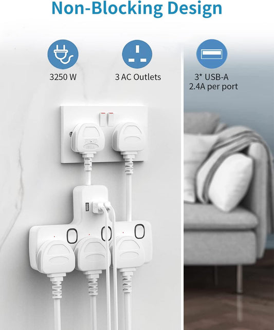 سلك تمديد 5 سم 3Gang مع 3 منافذ USB-A، مع مفاتيح فردية