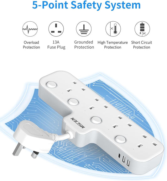 سلك تمديد 5 سم 4 مجموعات مع 2 منفذ USB-A و1 من النوع C، واقي من التيار الزائد