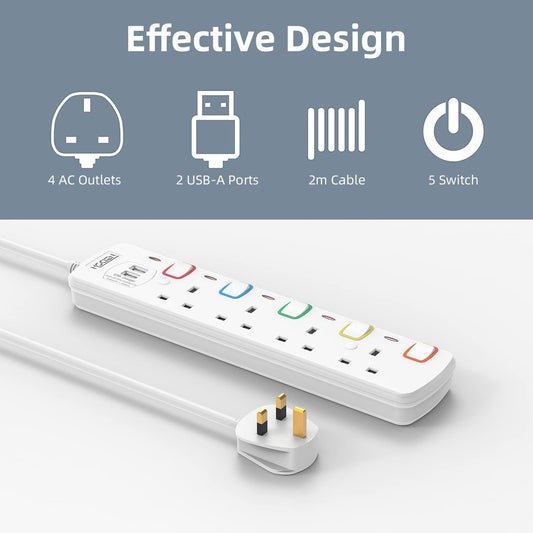 كابل تمديد 4M 4Gang بفتحتين USB-A، مع مفاتيح فردية، وشريط طاقة قابل للتركيب