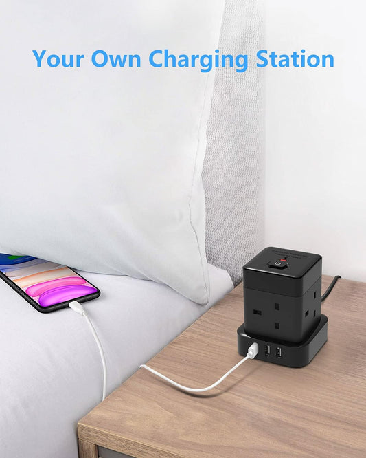 كابل تمديد 4M 4Gang Cube مزود بـ 3 فتحات USB-A، مع مفتاح، أسود، مقاوم للحمل الزائد
