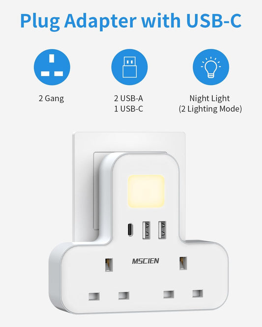 محول قابس ثنائي النطاق مع USB (1USB-C، 2 USB-A)، مع إضاءة ليلية، وحماية من الحمل الزائد